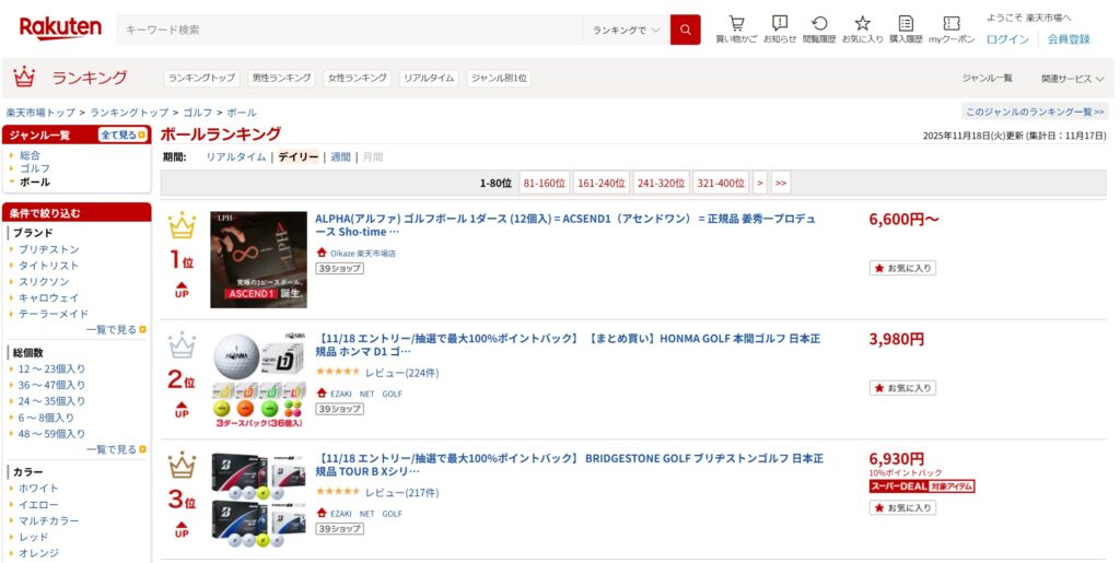 楽天市場 ゴルフ部門・ボール部門